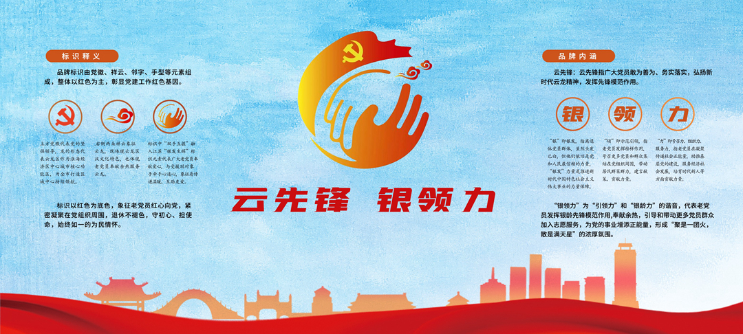 “云先锋·银领力”老党员志愿服务品牌传承自“云先锋”云龙区党建品牌,是党建引领下以离退休党员为主体的红色志愿服务品牌。云先锋指广大党员敢为善为、务实落实,弘扬新时代云龙精神,发挥先锋模范作用。“银领力”为“引领力”和“银龄力”的谐音,代表老党员发挥银龄先锋模范作用,奉献余热,引导和带动更多党员群众加入志愿服务,为党的事业增添正能量,形成“聚是一团火,散是满天星”的浓厚氛围。“云先锋·银领力”老党员志愿服务品牌的创建,是深化“银发生辉、银龄行动”的有力举措,全面展示了全区老干部老党员的新形象,开启了老干部老党员常态化志愿服务新篇章。