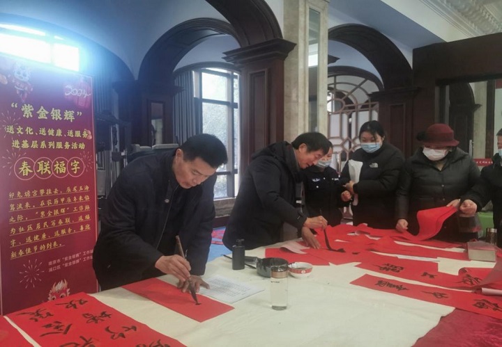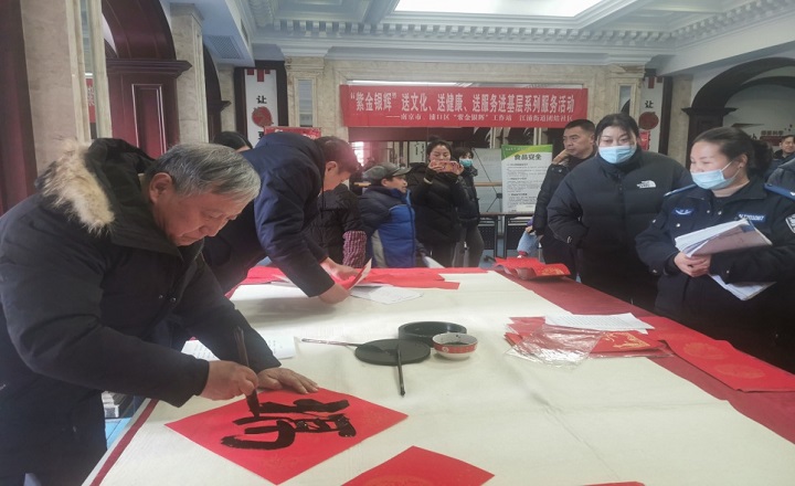 1月23日下午,南京市“紫金银辉”老专家们来到浦口区江浦街道团结社区,在满满的喜庆氛围中开展“送文化、送健康、送服务”进基层系列活动,用他们的笔墨和专业服务,为社区居民送上一份特殊的春节祝福。