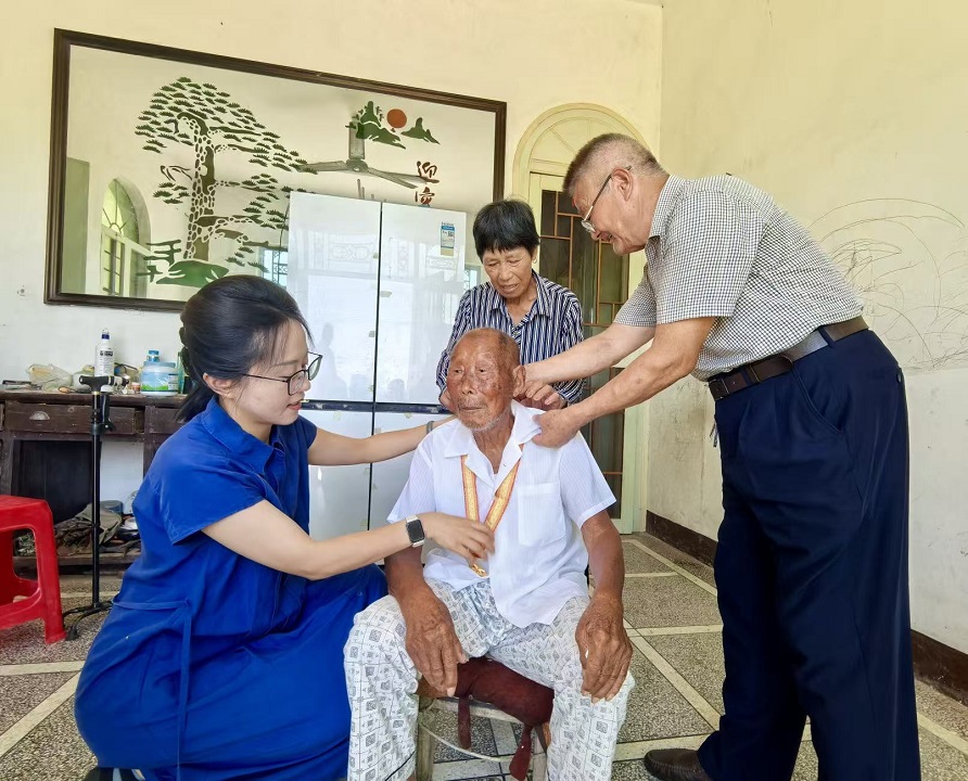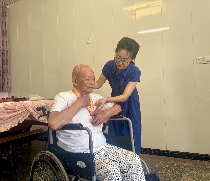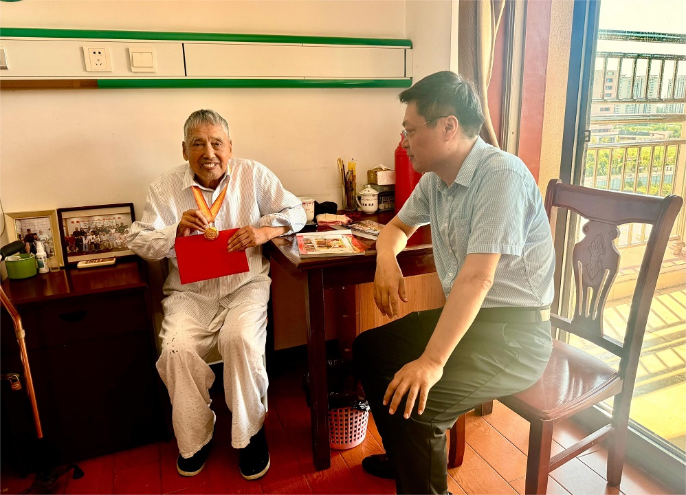 每到一处,慰问组一行与老同志及其家属亲切交谈,聆听他们讲述抗战时期的英勇事迹,关心询问老同志的身体健康状况与生活起居情况,祝愿老同志们健康长寿、幸福平安,向老同志为党和人民事业作出的重要贡献表示崇高敬意。同时,叮嘱家属要细心照顾好老人的日常生活,有什么困难及时反映,确保老人安享幸福晚年。慰问组还为老同志送上“中国人民抗日战争胜利80周年”纪念章,将党和政府的温暖与敬意送至老同志心中。收到纪念章,老同志们激动地说道:“感谢党和政府始终牵挂着我们,这枚纪念章,是历史的见证、是荣誉的象征,让我们倍感光荣。”