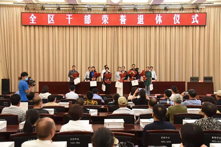 结合各单位工作实际,采取“多人一仪式”或“一人一仪式”方式,常态化举行干部荣退仪式,及时传递组织的关心关爱。自2021年全面推广干部荣退制度以来,全区各机关、事业单位、镇(街道)共举办荣退仪式127场次,参加仪式新退休干部539人。注重丰富深化荣退仪式内容,探索制定完善干部荣退“十个一”制度,同时增加新老结对服务、工作时光影集、助力老有所学等实事内容。