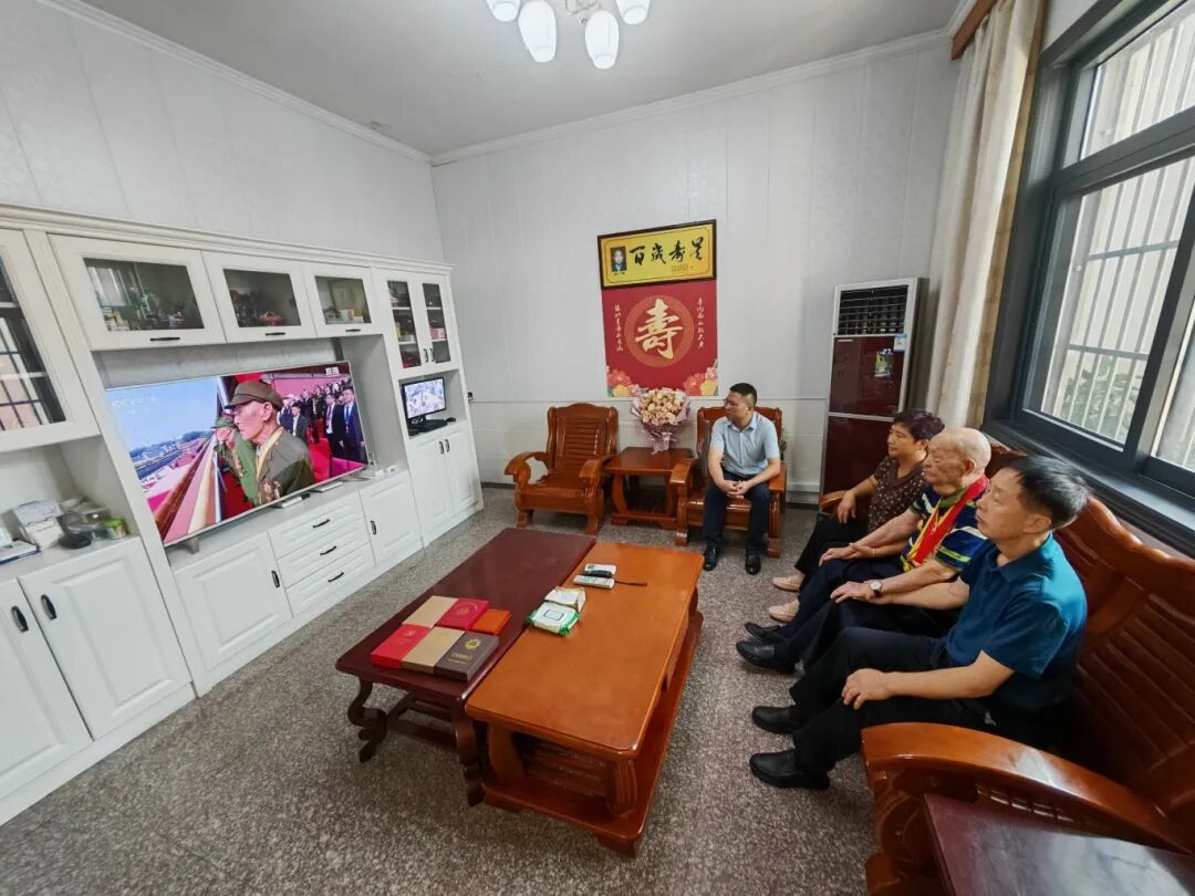 107岁的抗日战争离休干部闻广德在家中收看了纪念中国人民抗日战争暨世界反法西斯战争胜利80周年大会的电视直播,当一列列整齐划一的部队方阵通过天安门广场,一批批先进军事装备亮相屏幕时,老人激动得眼含热泪,嘴角也忍不住地颤抖起来。闻广德的女儿闻桂香告诉记者,为了观看此次阅兵,老人今天特意比往常提前起床,仔细佩戴上一枚枚沉甸甸的军功章,与子女一起守在了电视机旁。据了解,闻广德1941年8月入伍,先后参加过抗日战争、解放战争、渡江战役,多次荣获军功章。看到如今祖国的强大,老人激动地竖起了大拇指。闻广德表示:“以为没有这么好的武器,中国强大了,我很开心!”