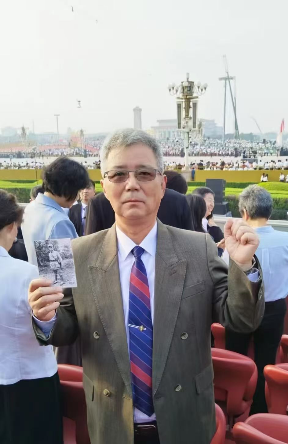 句容籍革命英烈巫恒通的后代受邀现场观礼阅兵仪式,巫恒通烈士是英勇不屈、绝食明志的新四军团长,今天巫充实带着爷爷巫恒通的照片去阅兵现场让爷爷也见证:我们胜利了!巫恒通表示:“我把爷爷照片一起带到现场,想让他和我们一道见证我们国家的繁荣,有幸参加这次观礼,心情无比激动,我们要铭记历史,缅怀先烈,珍爱和平,开创未来。”