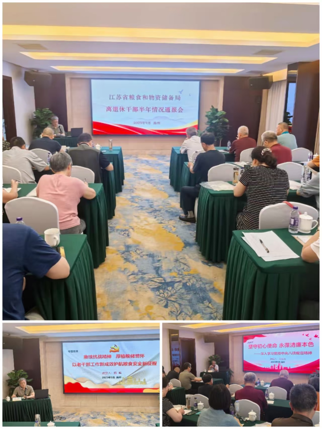 为巩固拓展中央八项规定精神学习教育成效,在中国人民抗日战争暨世界反法西斯战争胜利80周年之际,省粮食和物资储备局组织部分离退休干部赴扬州开展“赓续抗战精神・永葆清廉本色——金谷银辉赋能江苏粮储事业高质量发展”主题党日活动。局一级巡视员韩峰、3个老干部党支部全体委员及支部后备人员、离退休干部处全体人员参加活动。