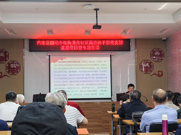近日,南京市国动办离退休干部党支部会同江苏省国动办离退休干部党支部、雨花台区国动办离退休干部党支部和梅清苑社区党总支,省市区社四级联动,围绕深入学习贯彻中央八项规定精神,共同开展“助力改革发展,汇聚银发动能”主题党日活动,引导老同志锤炼坚强党性,保持优良作风,争当“银发先锋”,努力为服务改革发展、助力基层善治和国防动员事业献智出力。