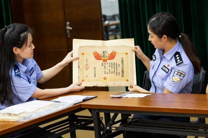 8月22日,市公安局离退休干部处联合办公室、鼓楼分局开展“永不褪色的忠诚”——50年代老奖状修复暨重温荣誉历程活动。市“紫金银辉”公安工作站站长、全国离退休干部先进个人、全省最美老干部杨志浩,“老警卫宁”志愿服务队队员、全国公安机关爱民模范、优秀人民警察钱定才,鼓楼分局中央门派出所教导员、二级英模、全国最美基层民警蔡文君,以及市局离退休干部处和办公室相关负责人、省厅报告团成员、基层民警代表参加了活动。