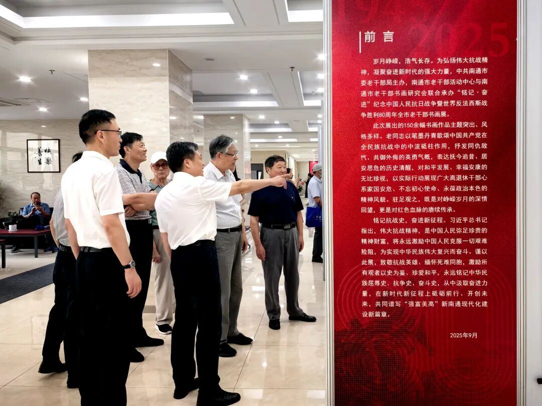 9月2日下午,由南通市委老干部局主办,市老干部活动中心、市老干部书画研究会承办的“铭记·奋进”纪念中国人民抗日战争暨世界反法西斯战争胜利80周年全市老干部书画作品展在市老干部活动中心拉开帷幕。老领导储长林、陈宋义等参加活动。市委组织部副部长、老干部局局长周健陪同老干部参观展览。